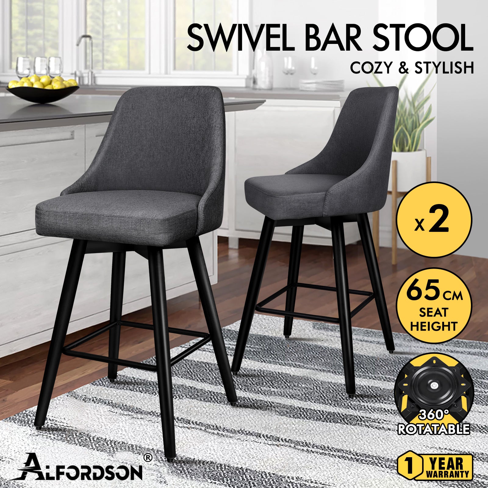 ALFORDSON 2x Swivel Bar Stools Kitchen Dining Chair Cafe Wooden DARK GREY