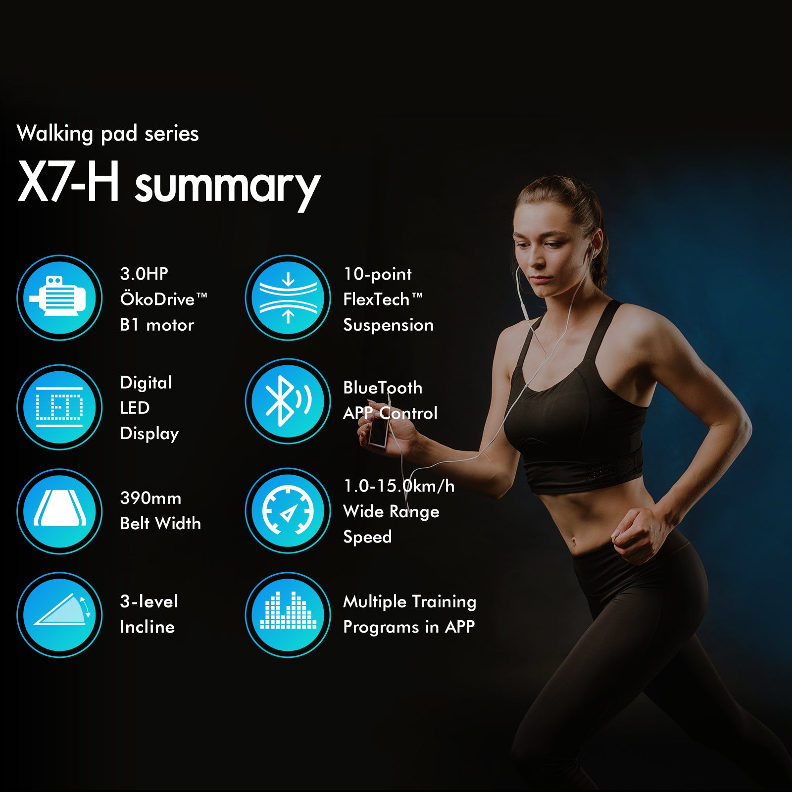 This Walking Pad X7-H is the ideal piece of in-home exercise equipment to get you moving and burning calories on a daily basis. With the unique built in Bluetooth technology, it allows wireless access to the FitShow® App on your phone to sync and track your workout stats. Similarly, equipped with a large LED display, you can stay in clear and precise control. It allows you to use metrics like speed, mileage, calories burned, and more to achieve goals and push your limit. Additionally, this treadmill features a powerful and energy-efficient 3.0HP ÖkoDriveTM B1 motor with digital quick speed control of 1-15KM/H. Either remote control or APP control can let you to enjoy the journey at your desired speed.