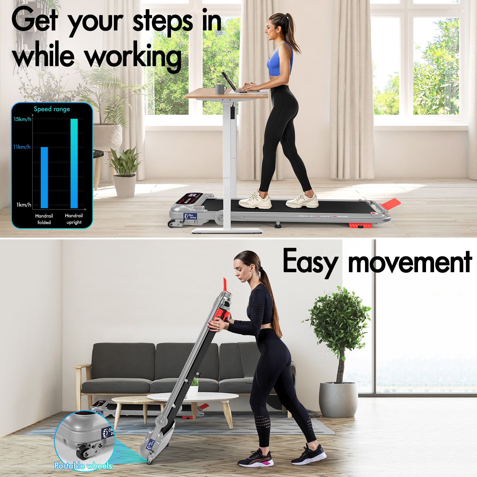 What's more, featuring 3-level incline function of this walking pad, you can increase your heart rate and boost calorie burning in tougher workout. The unique foldable handrail and portable wheel design make it a breeze to move around and store it under the sofa or bed.