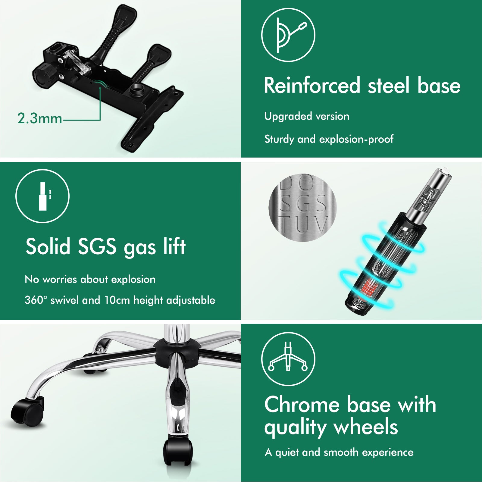 A stylish chrome base with TUV certified casters, Intertek approved PU leather, SGS approved Gas-Lift system and tilt function, delivering absolute five star luxury.
