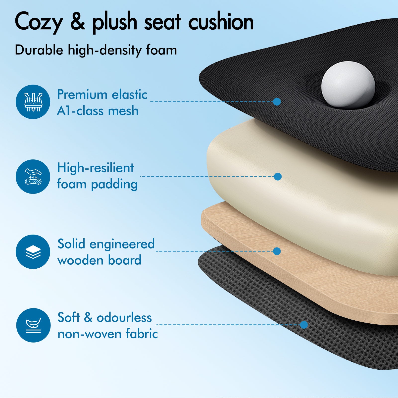 * Triple-layer seat: Mesh fabric + resilience foam + wooden board
