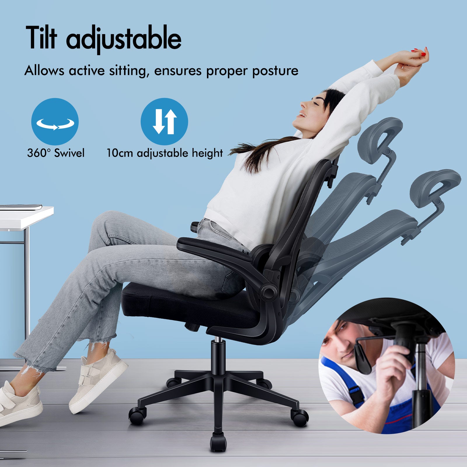 It features flip-up armrests that fit under your desk as you wish. A stylish nylon base with TUV certified casters, Intertek approved mesh fabric, SGS approved Gas-Lift system and tilt function, delivering absolute five star luxury. Combined with flexible tilt adjustment that suits your personalized positions while sitting, sleeping or playing games. An elite in quality and design, your solution to true comfort.