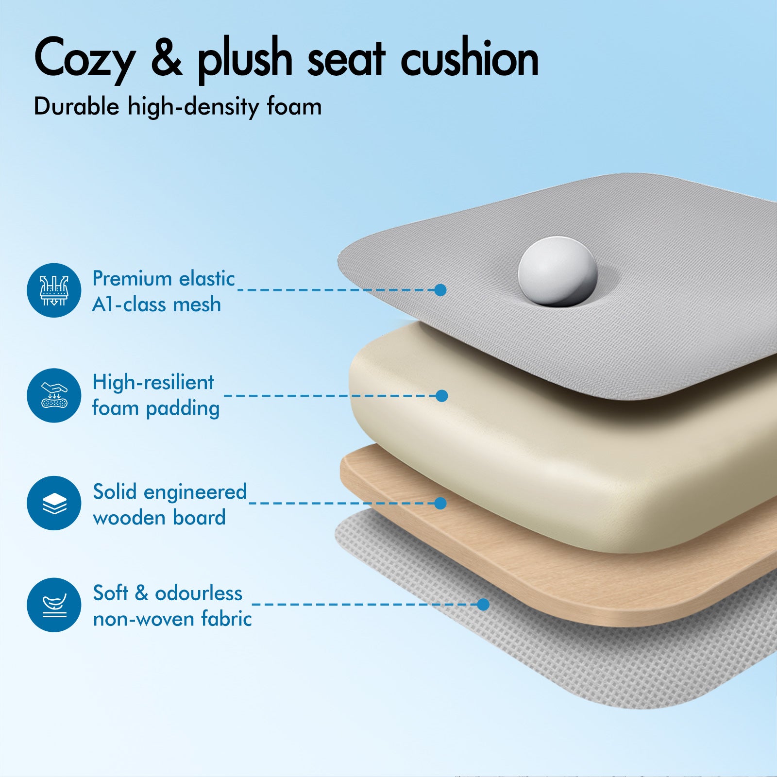 * Triple-layer seat: Mesh fabric + resilience foam + wooden board