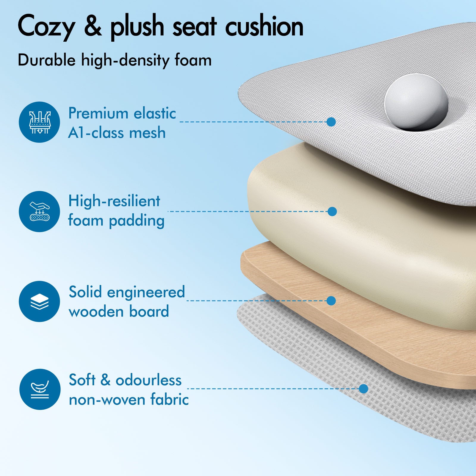 * Triple-layer seat: Mesh fabric + resilience foam + wooden board