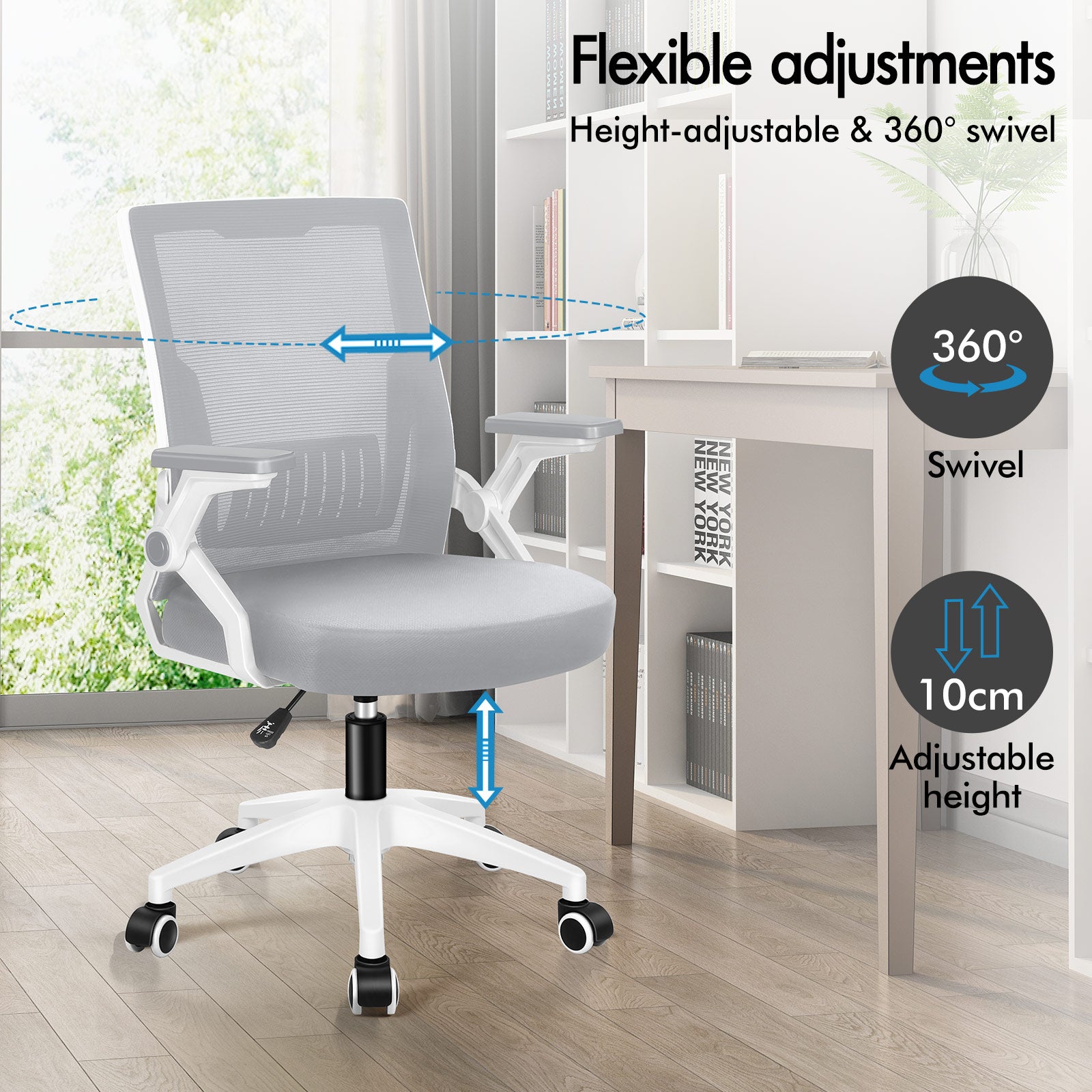 This computer chair features an ergonomic S-curve with a non-headrest design to set your shoulder free, medium back for easy movement. The advanced mesh upholstery used on the back provides ultimate support, also eliminating the risk of sagging. Additionally, the desk chair comes with horizontal adjustable and retractable armrests that fit under your desk as you wish.