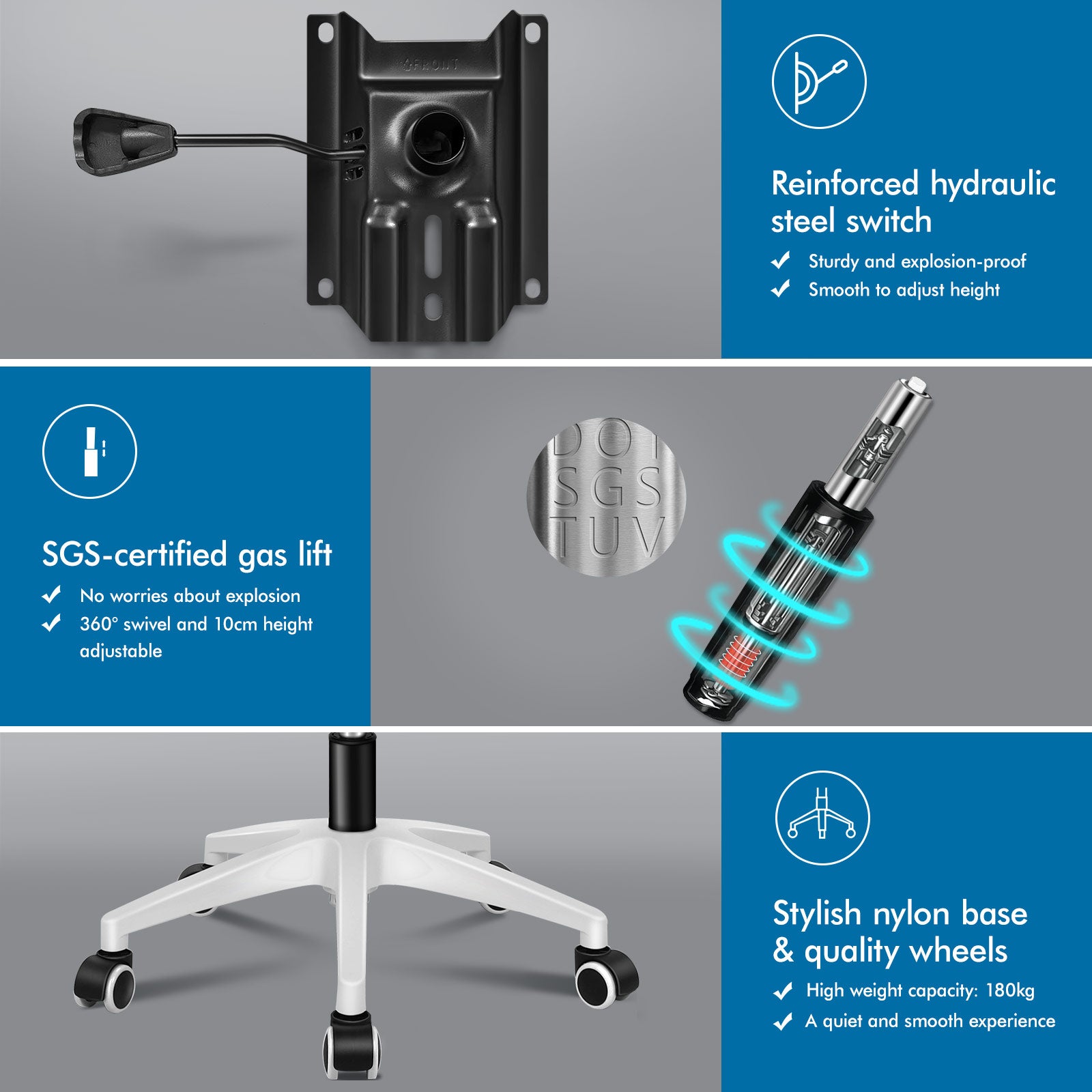 A stylish nylon base with TUV-certified casters, Intertek-approved mesh fabric, SGS-approved Gas-Lift system, ensuring optimal durability and delivering absolute five-star luxury.