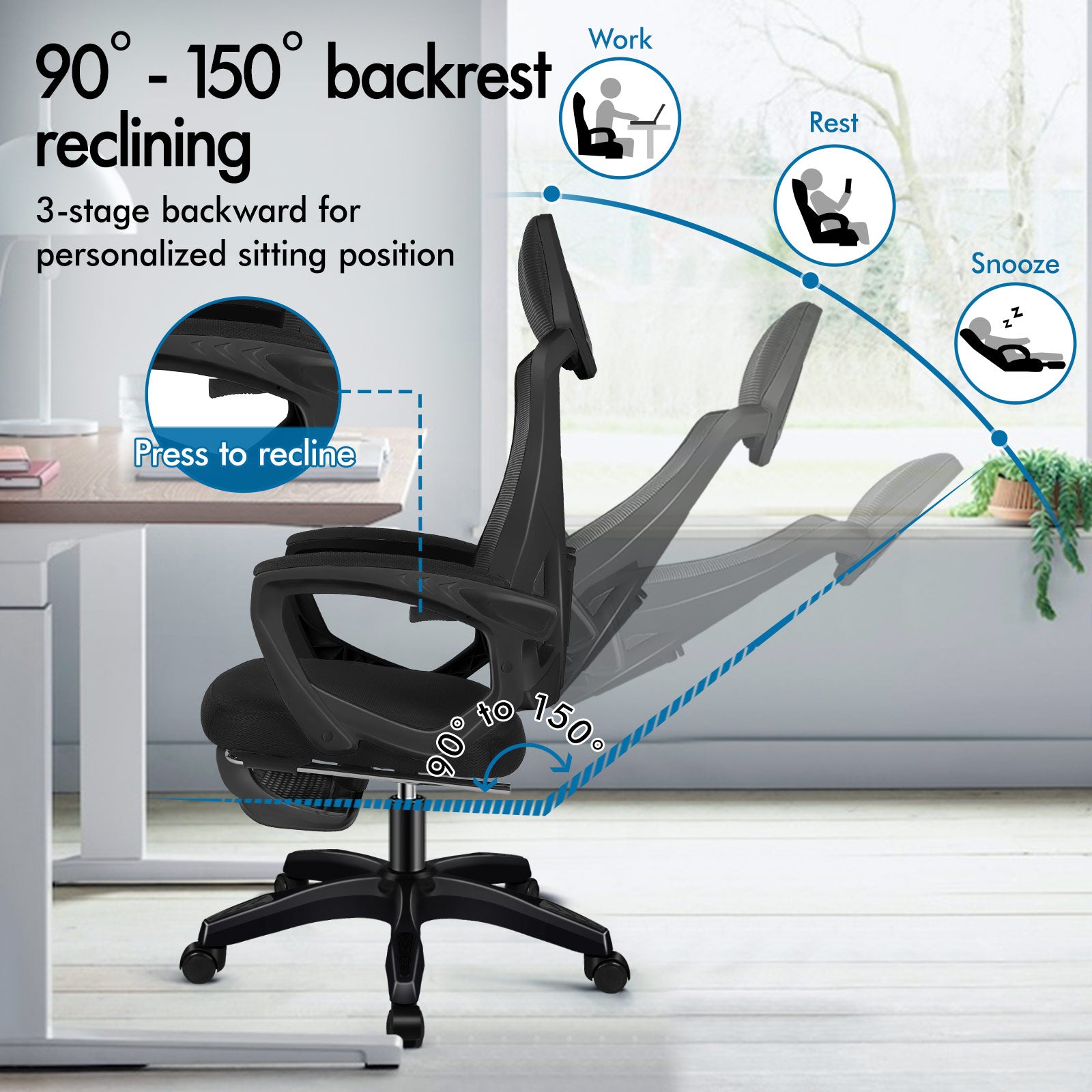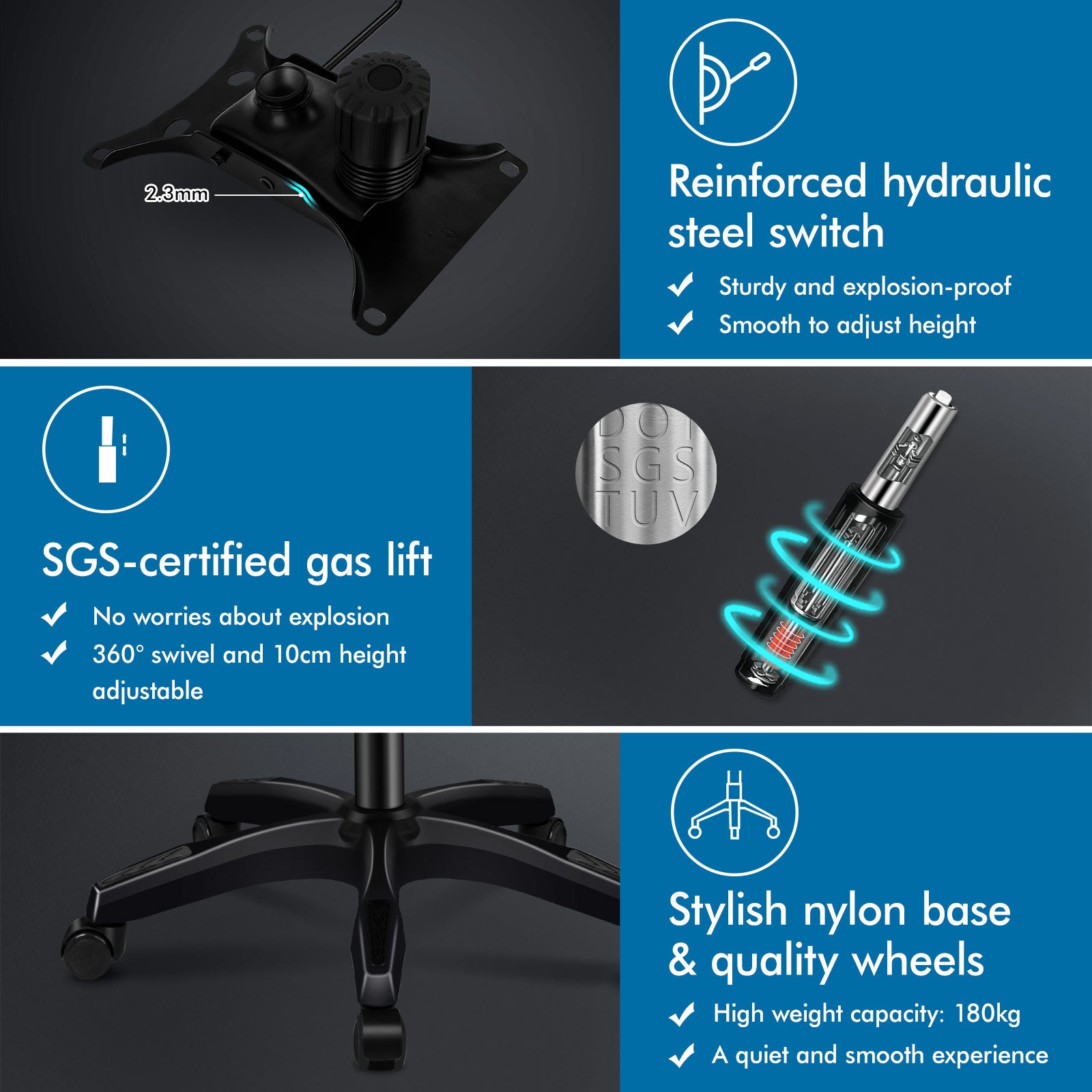 Combined with retractable footrest, our generous 150 degree of recline and sturdy tilt mechanism accommodates effortlessly to your favorite posture while sitting, sleeping or playing games, whether you're sitting straight or leaning back. A stylish nylon base with TUV certified casters, Intertek approved mesh fabric, SGS approved Gas-Lift system and tilt function, delivering absolute five star luxury.