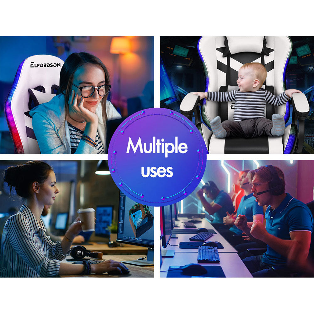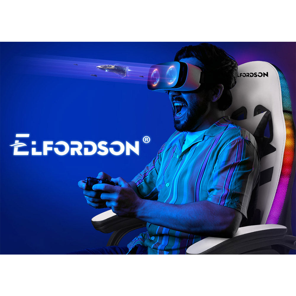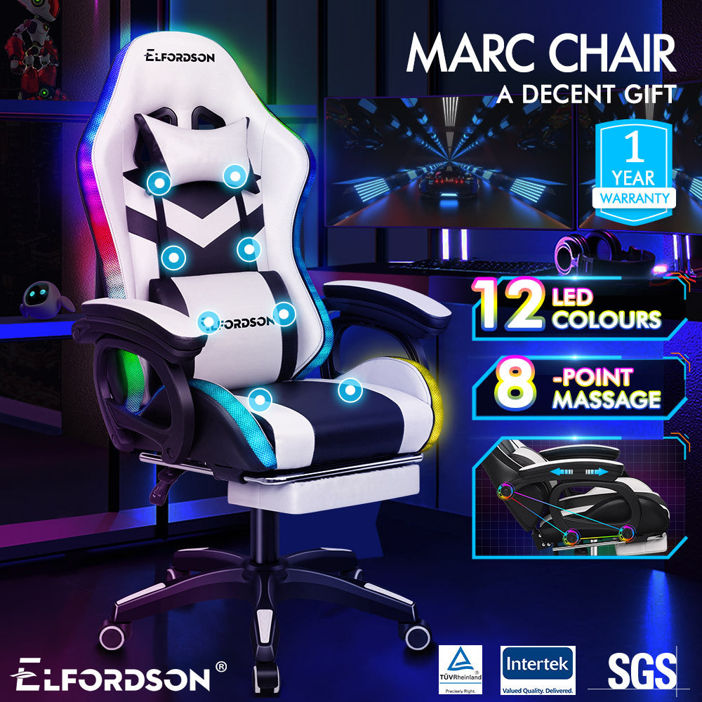 ELFORDSON Gaming Chair with RGB LED Light 8-Point Massage, White & Black